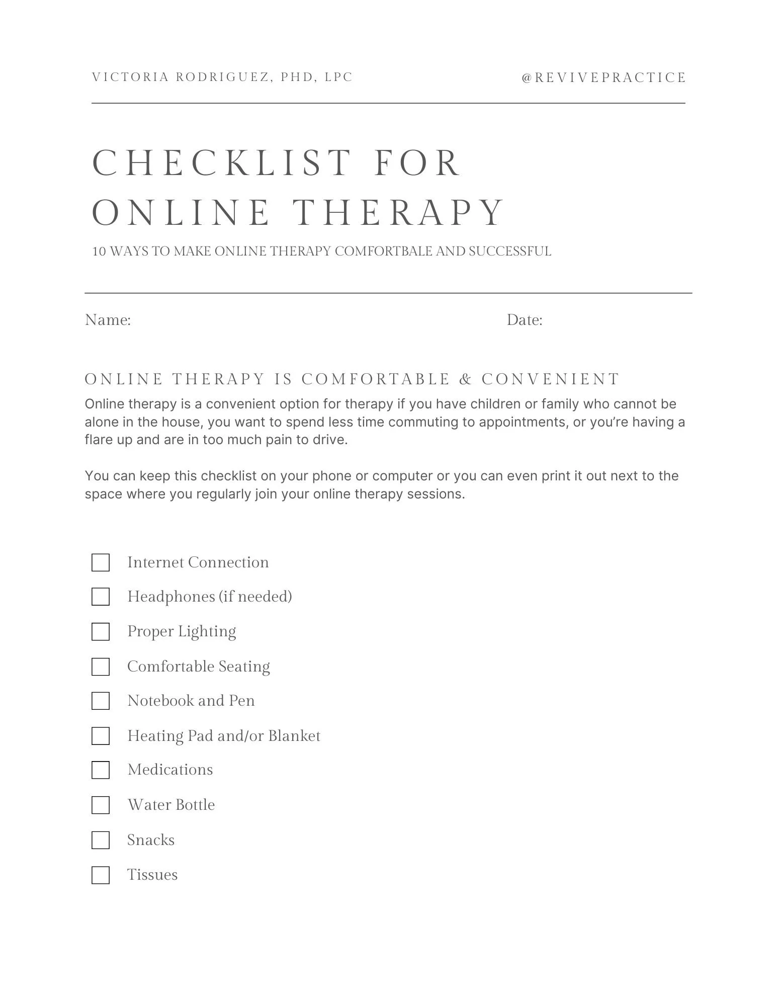 Download the attached “Checklist for Online Therapy” so you can keep this checklist on your phone or computer or you can even print it out next to the space where you regularly join your online therapy sessions. Having a clear checklist can help you remember your needs, especially on days where you might be experience brain fog.